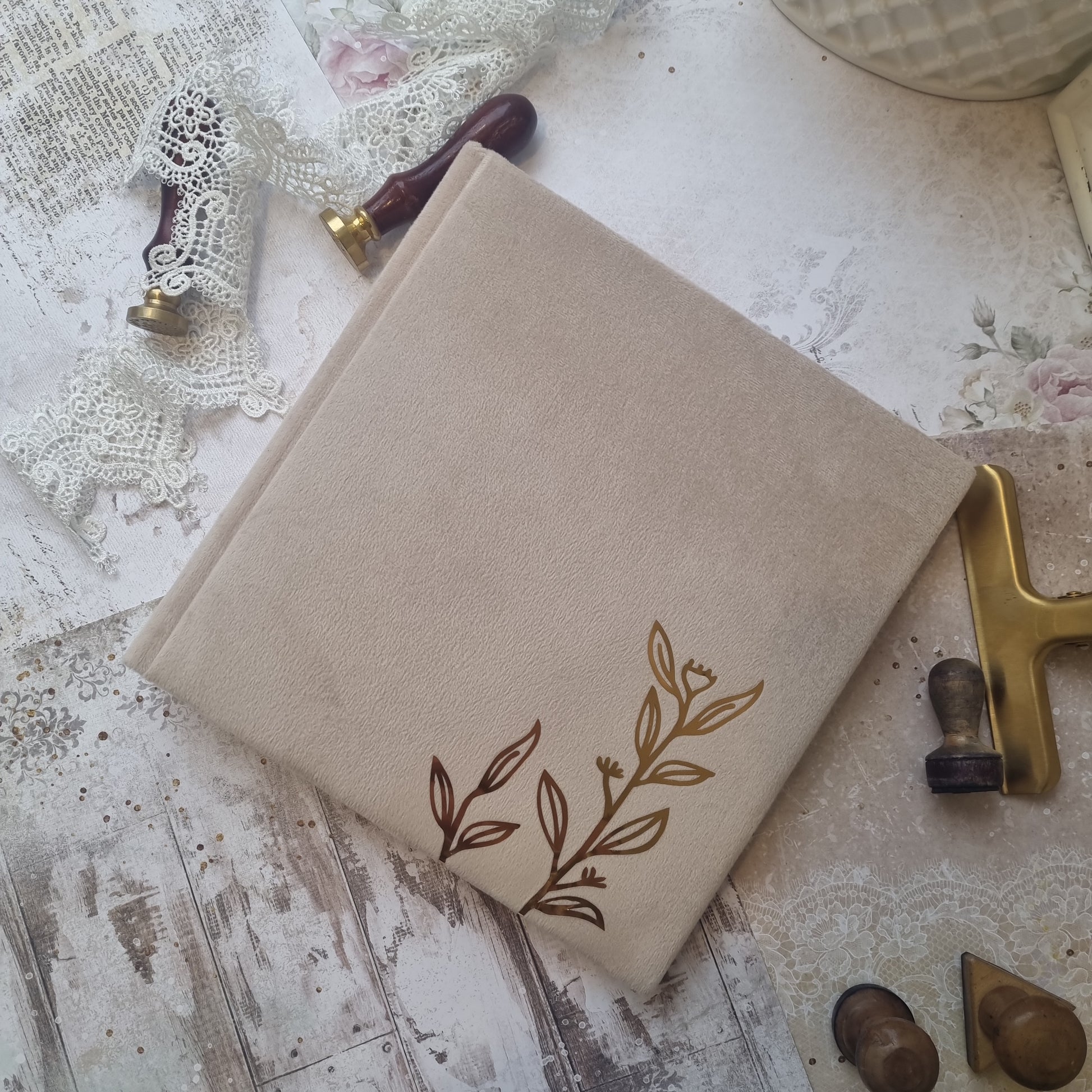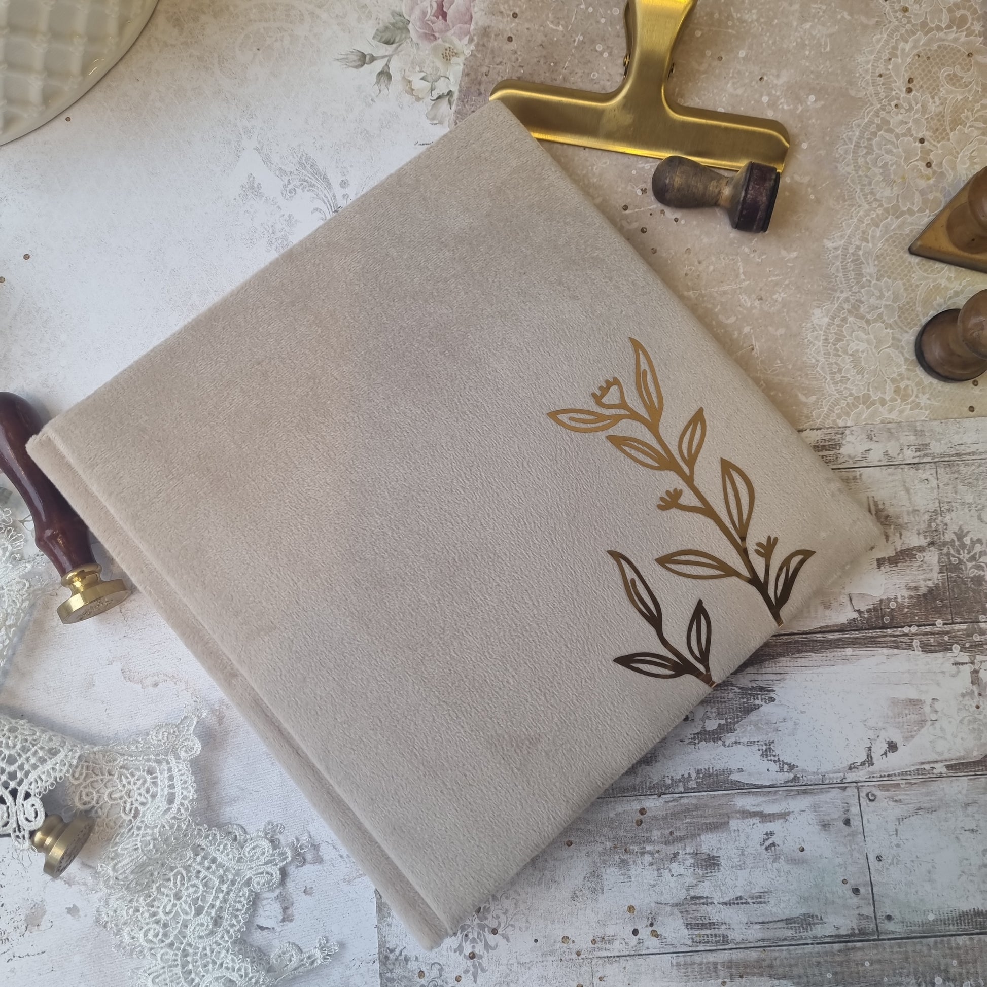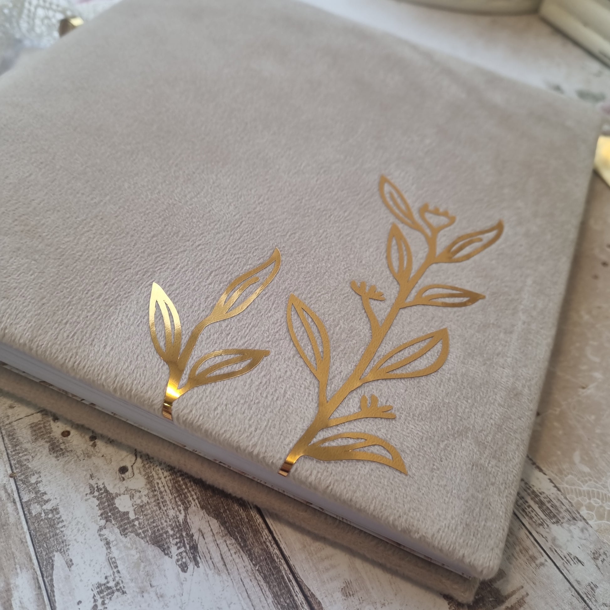 Albumo viršelis dengtas švelniu veliūro audiniu, papuoštas aukso spalvos floristiniais motyvais.