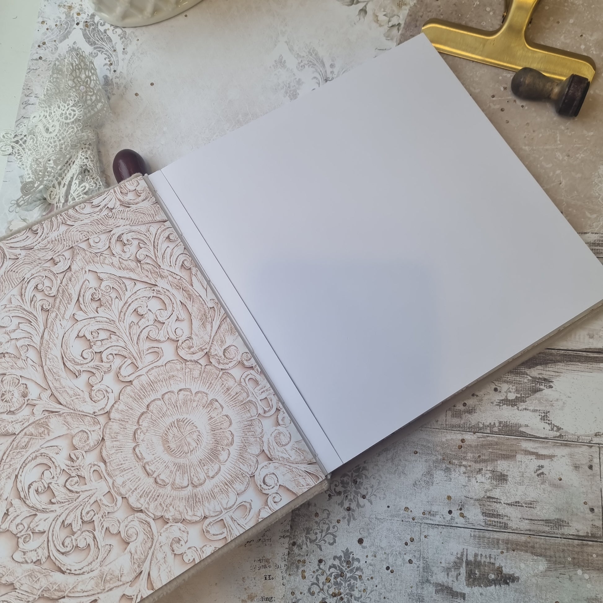 Albumos dydis 21x21 cm, viduje 30 kieto, balto popieriaus lapų, tinkamų rašyti ir klijuoti nuotraukas.