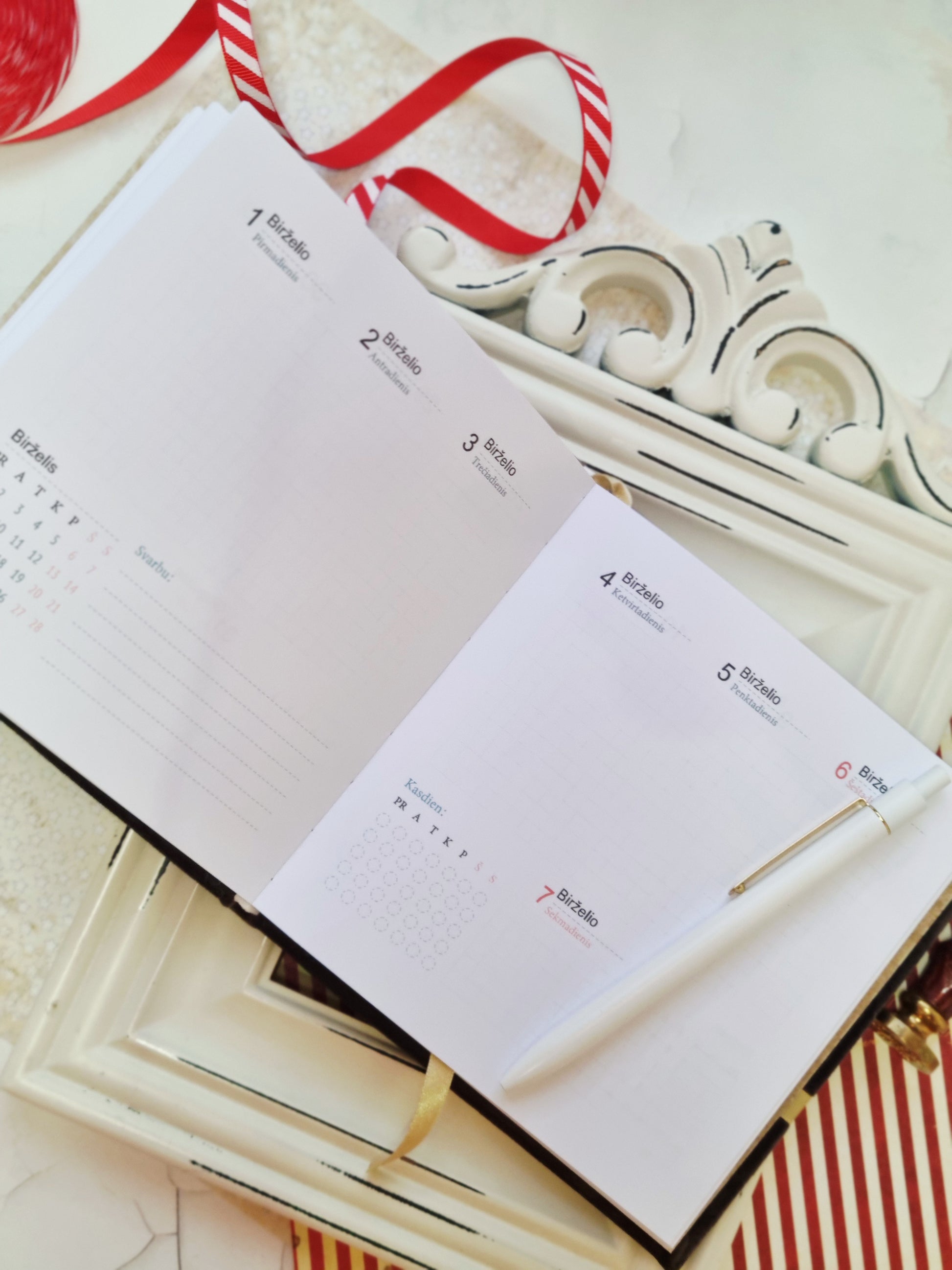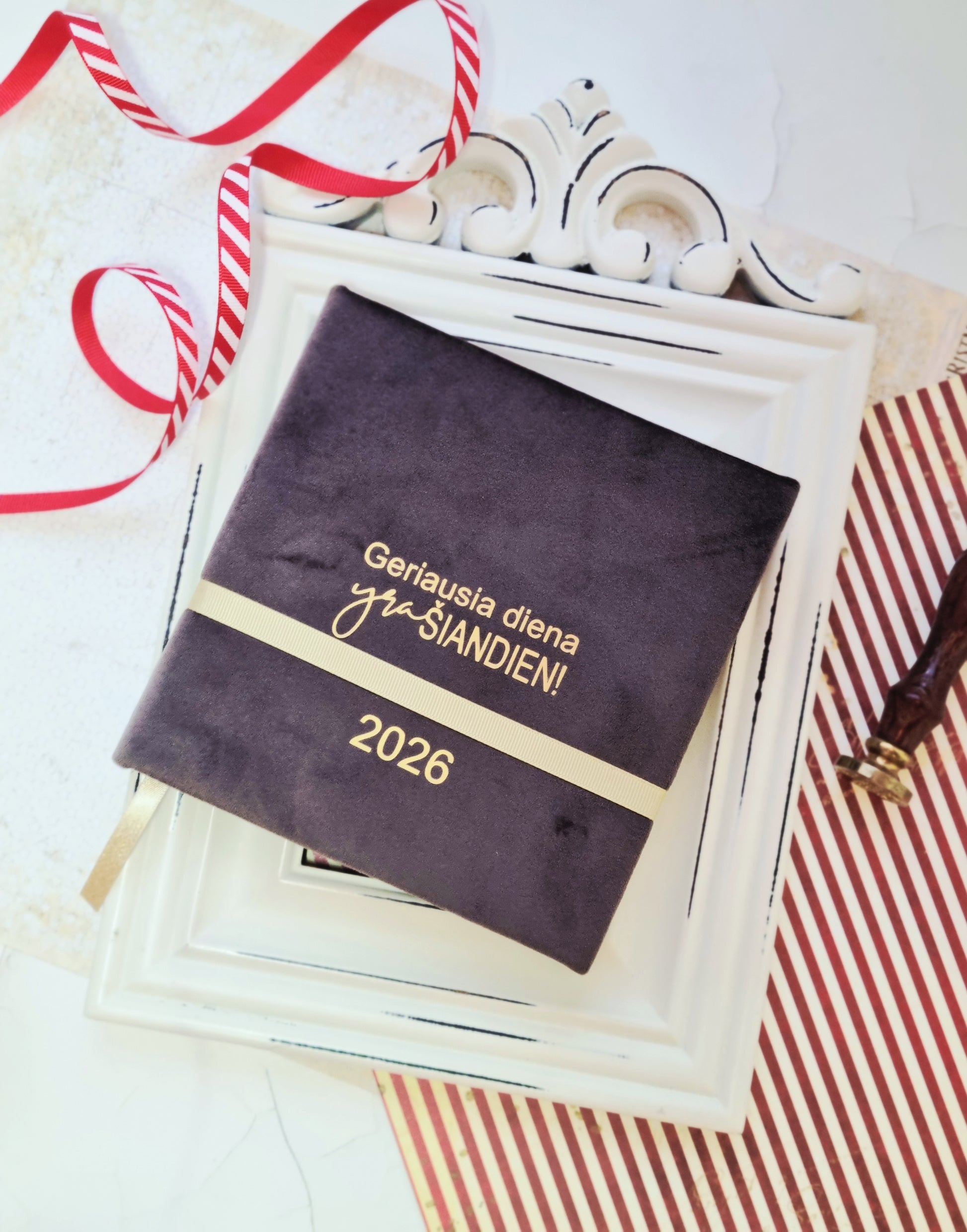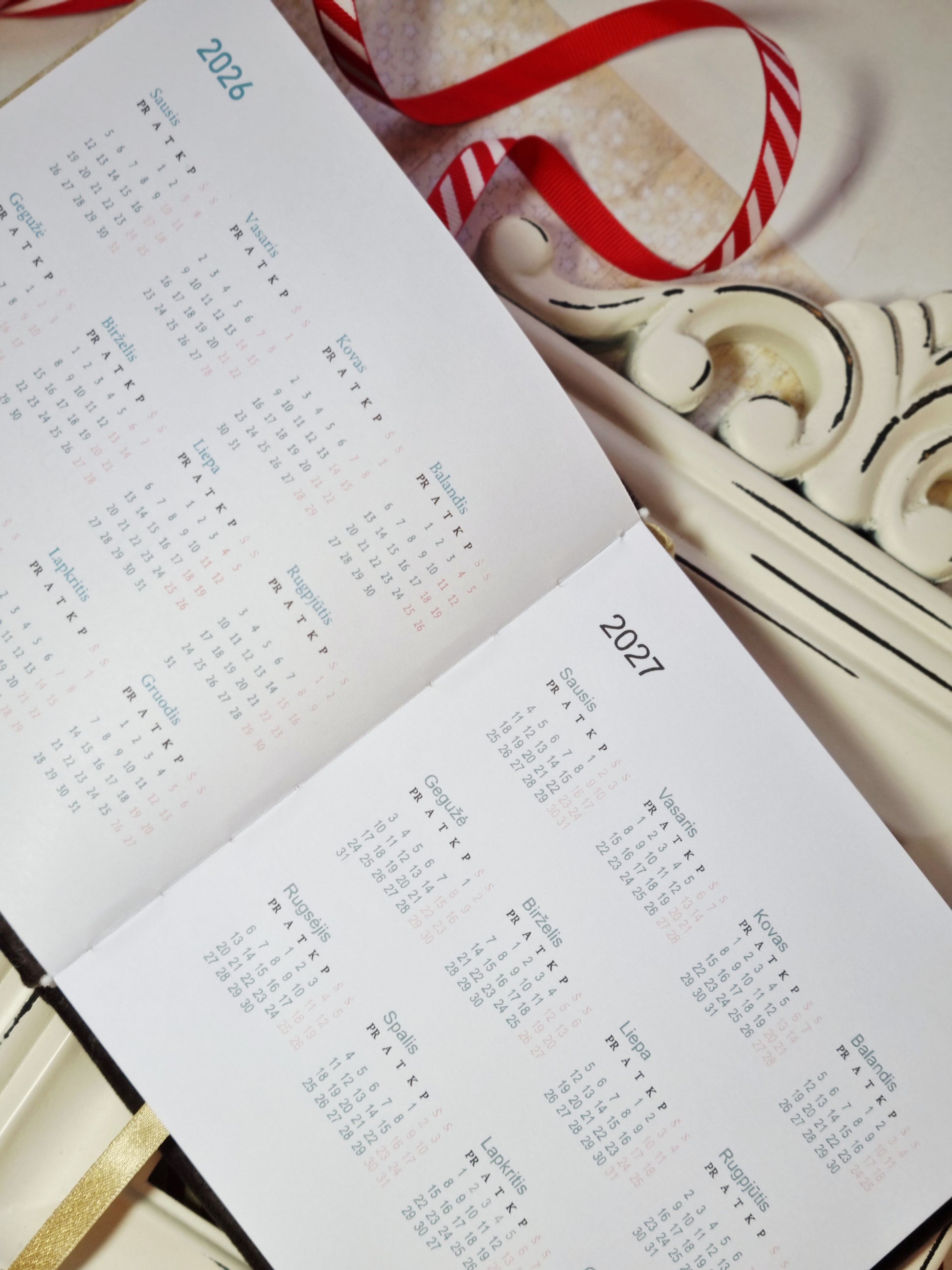 Kalendorius pagamintas iš kietesnio popieriaus, tad rašant tikrai nepersišvies. Viršelis dentas švelniu veliūriniu audiniu, papuoštas juostele ir aukso spalvos užrašu.