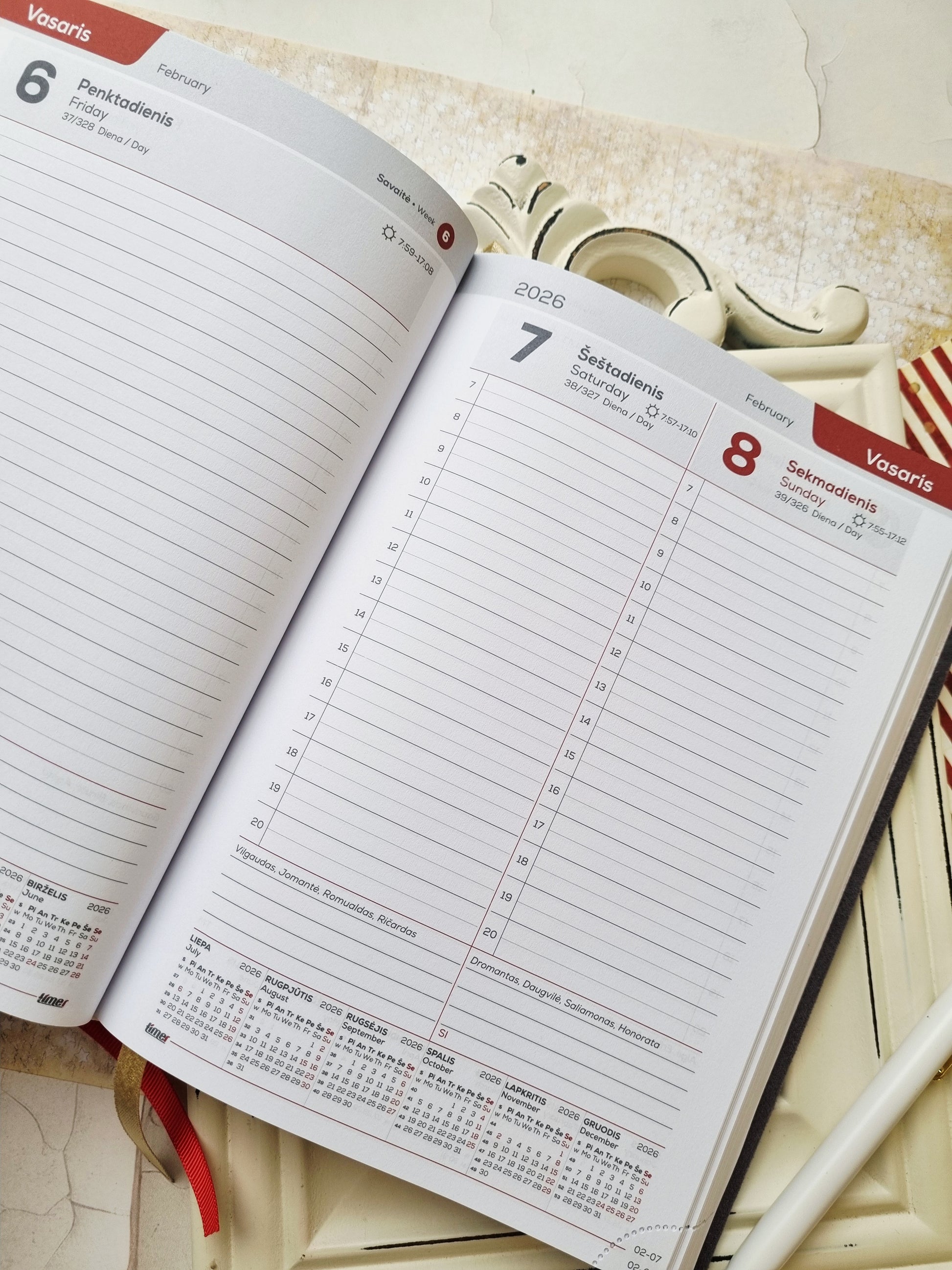Knyga ne tik išskirtinė ir puošti, ji funkcionali. Formatas A5, darbo dienoms skirta po puslapį, o savaitgalis patogiai padalintas į dvi dalis vertikaliai.