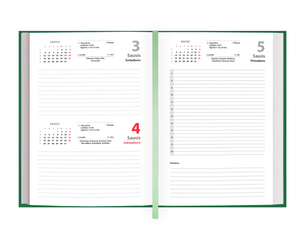 Darbo knyga A5 formato, 352 psl. Šventinės dienos, mėnulio fazės, vardadieniai, patogus darbo dienos planavimas.