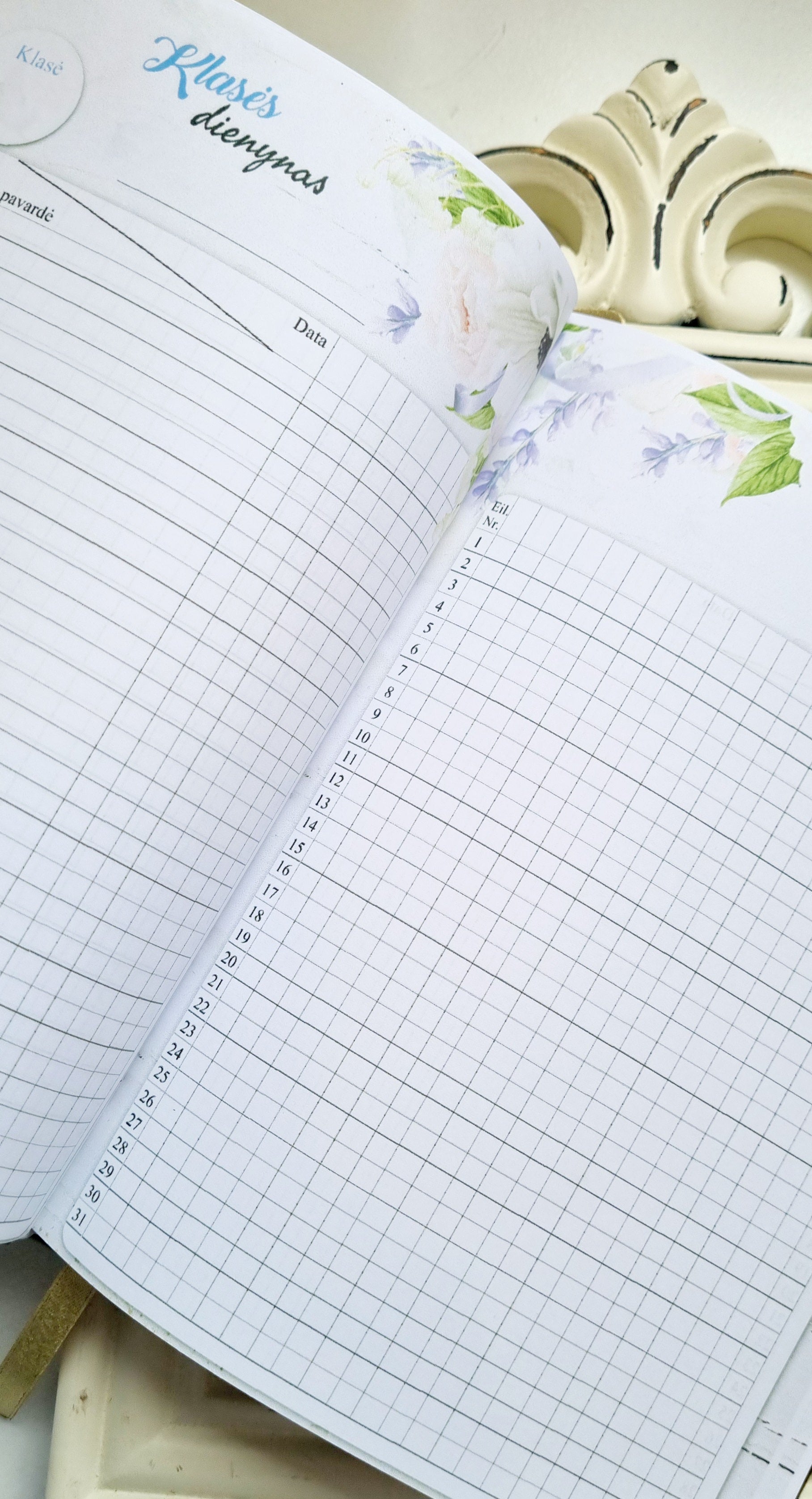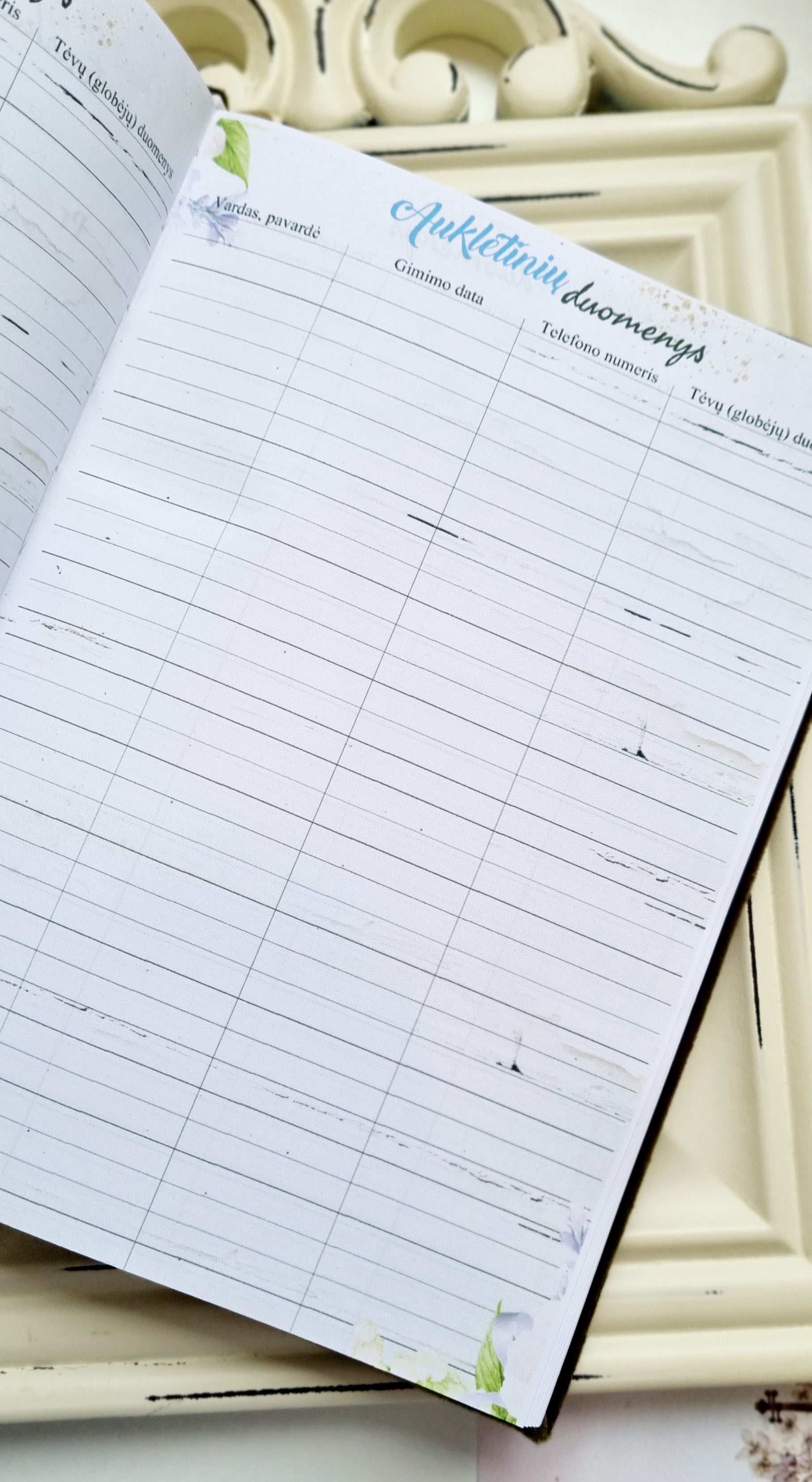 Knygoje rasite skyrius klasių dienynams vesti, mėnesio darbams planuoti, darbui su auklėjamąja klase ir daug kitų puslapių naudingiems užrašams.