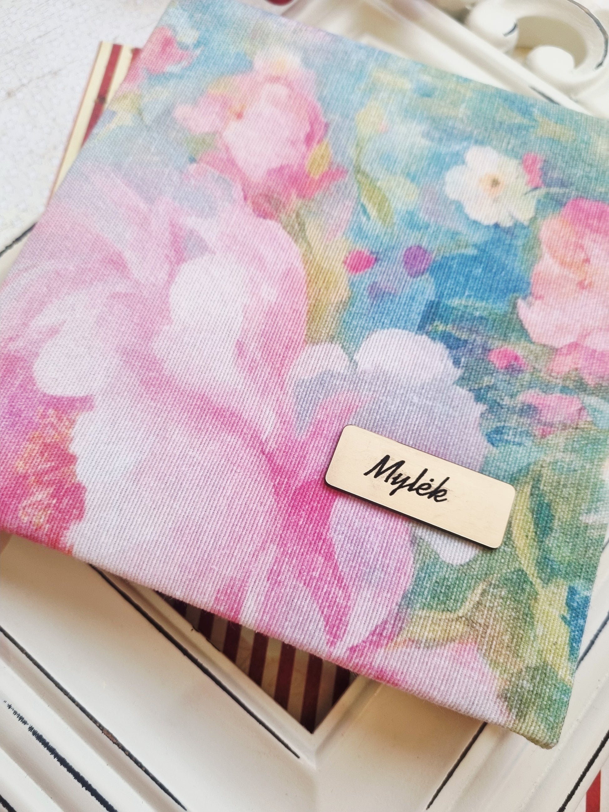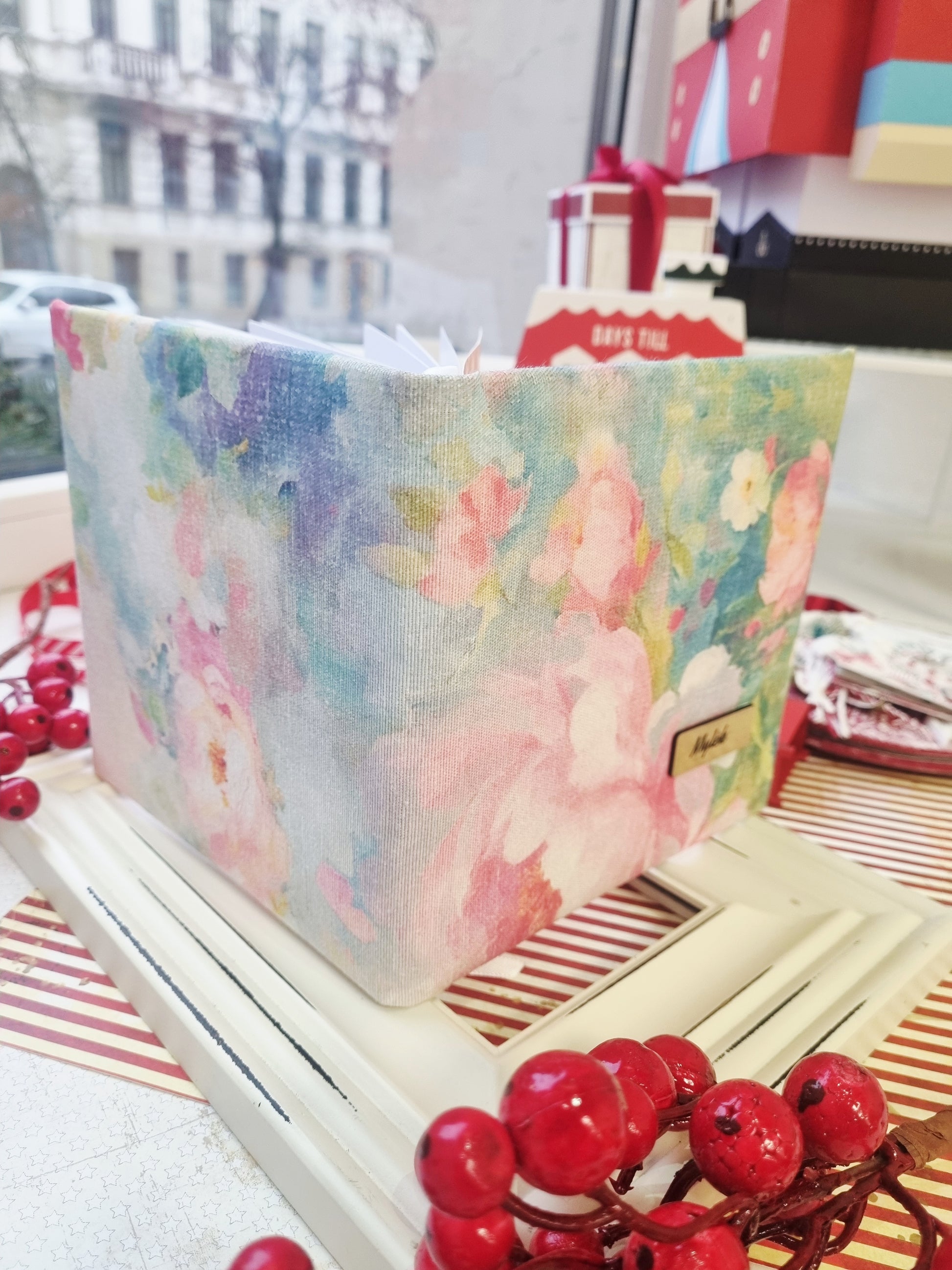 Knygelės dydis 15x15 cm, viršeliai dengti įspūdingu lyg akvarele pieštu audiniu.