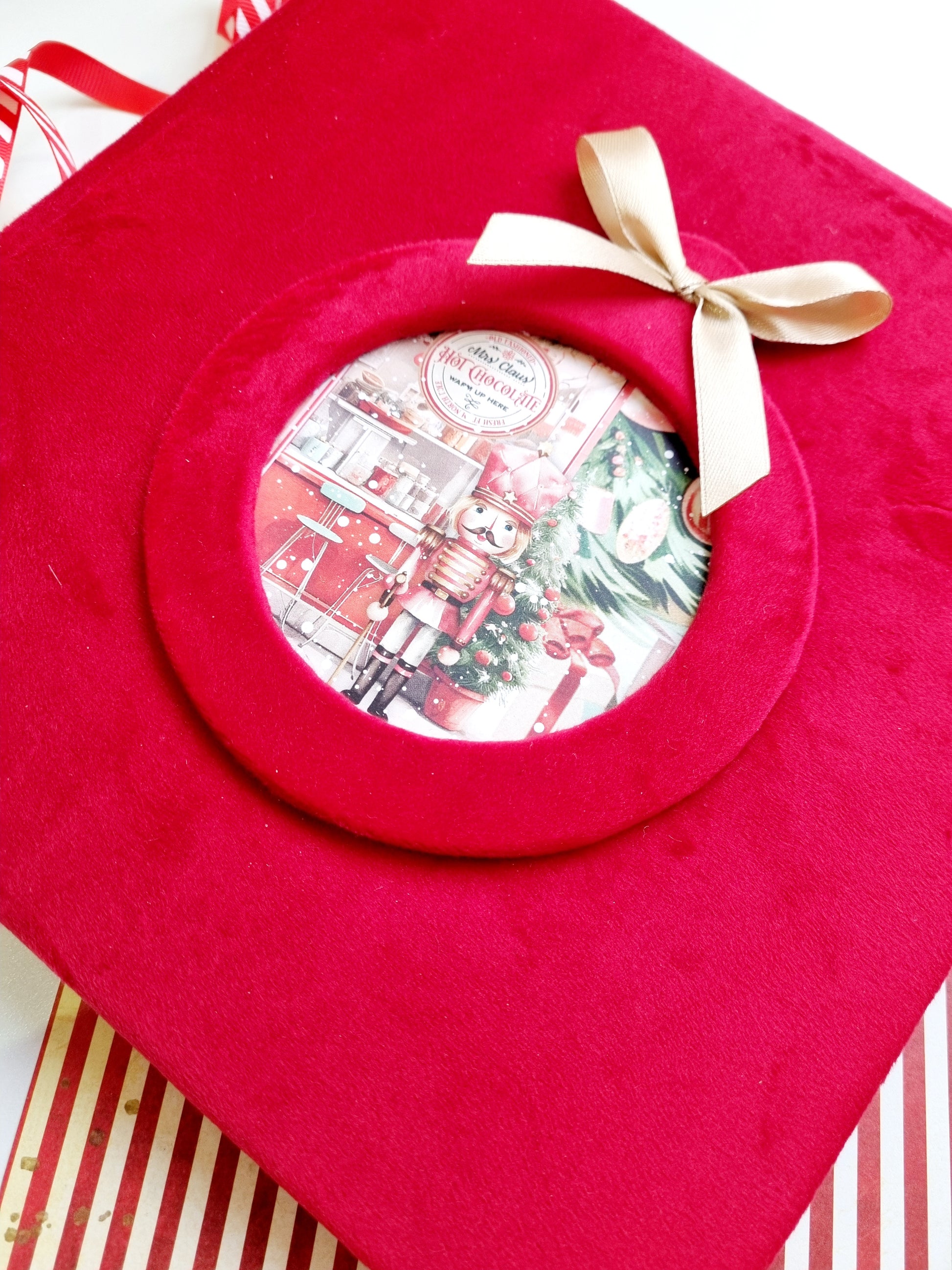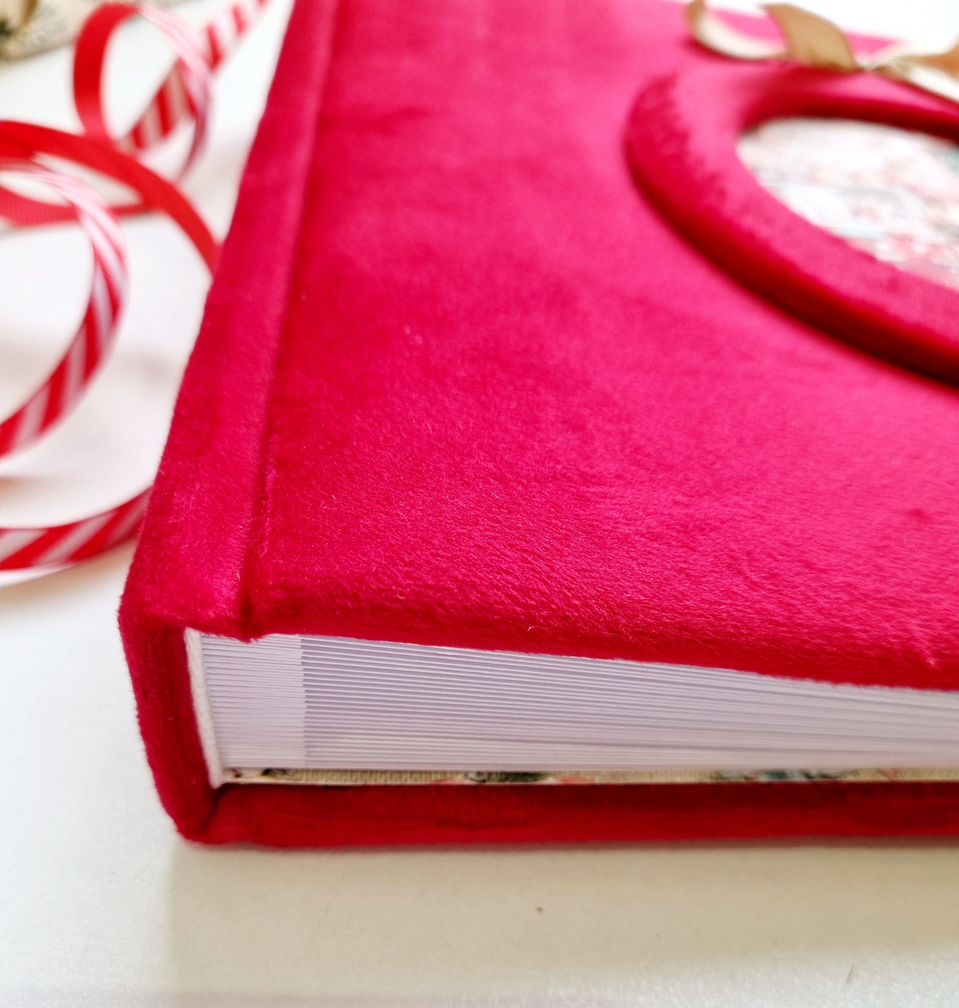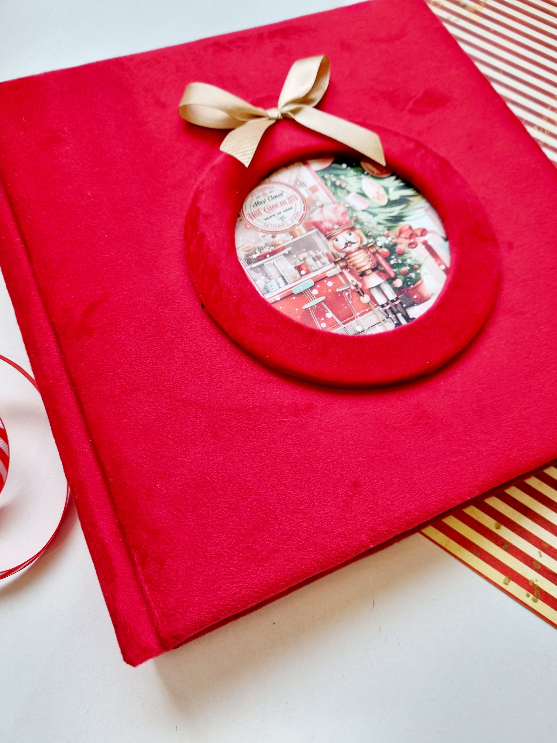 Albumo viršelis dengtas švelniu veliūru, paminkštintas. Viršelį puošia nuimamas žaisliuko formos rėmelis. Paveikslėlį rėmelio viduje galite pakeisti į savo nuotrauką, tad albumas bus išties išskirtinis. Nuotrauką galite keisti kasmet, o albumą naudoti šventiniam dekorui.