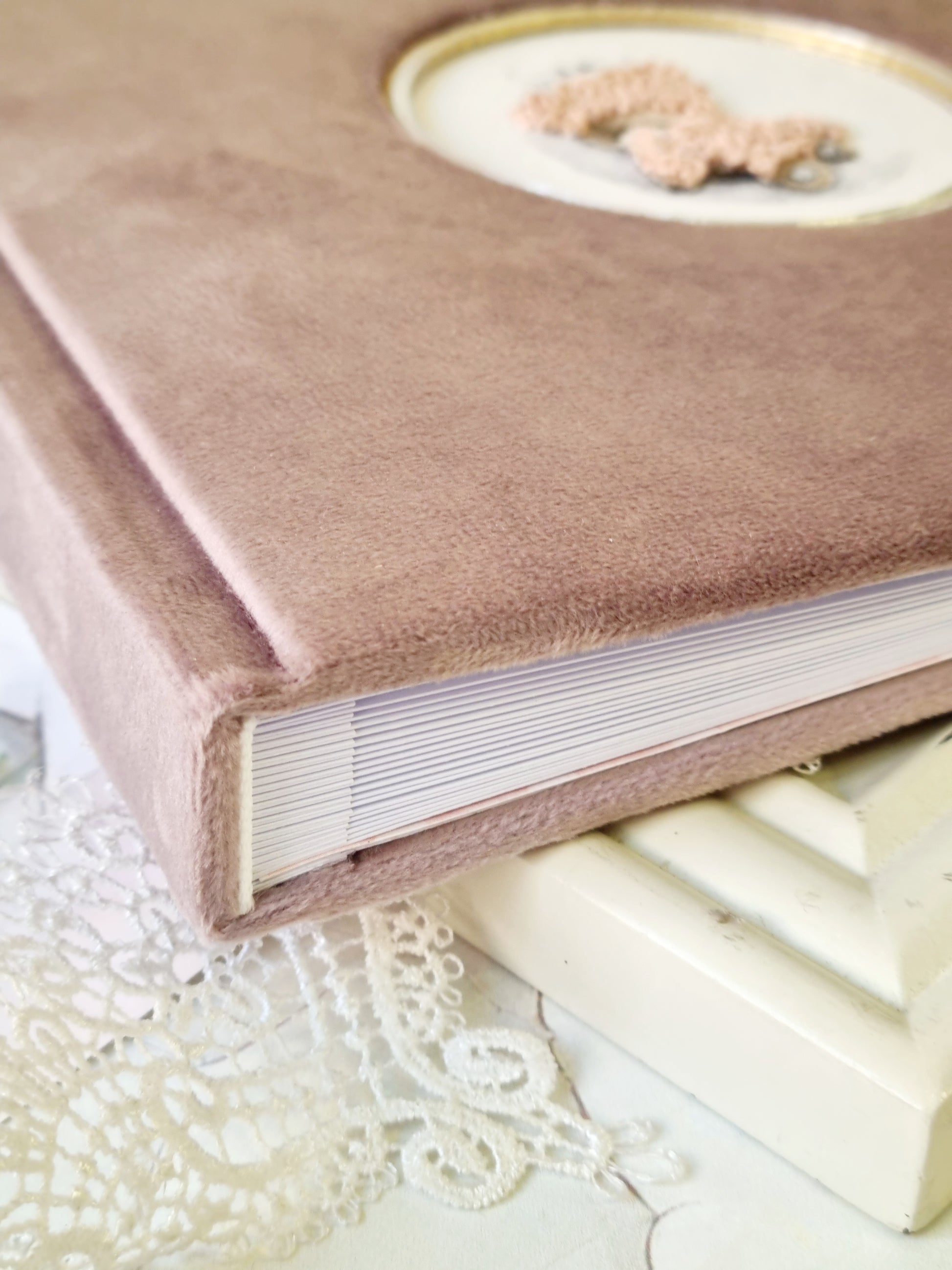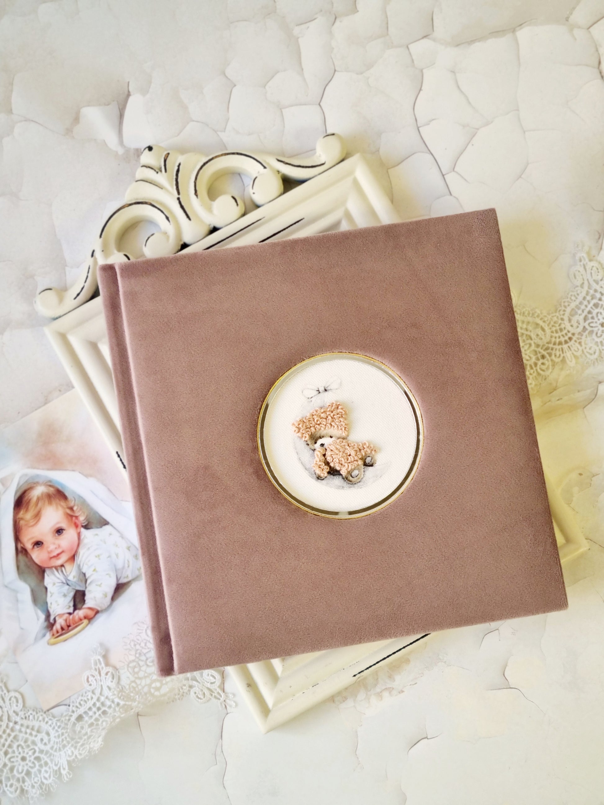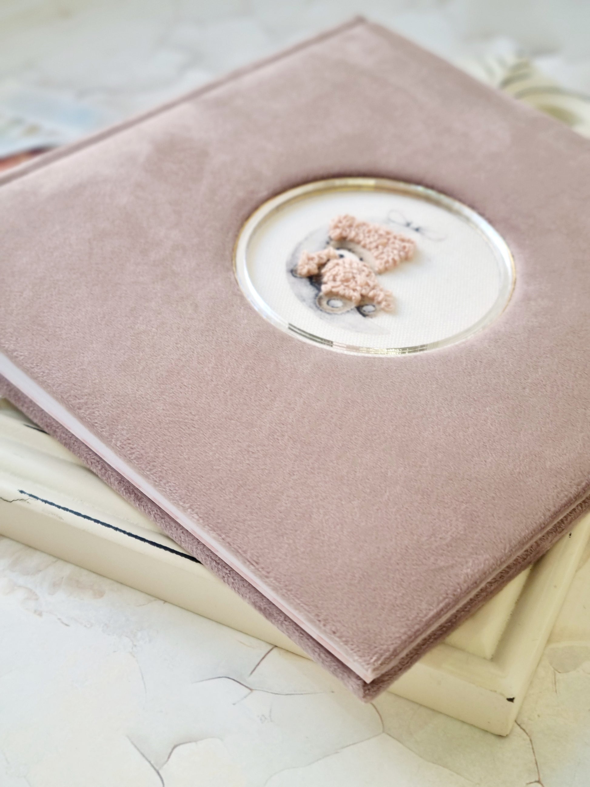 Šis albumas išties ypatingas. Rankomis siuvinėta meškutė nepalieka abejingų. Jos gauruotą kailiuką visada norisi pakutenti. Kudliukė įsitaisiusi rėmelyje su veidrodiniu apvadu, žaismingai žybčiojančiu saulutėje. Viršeliai dengti aukšto kokybės veliūru.