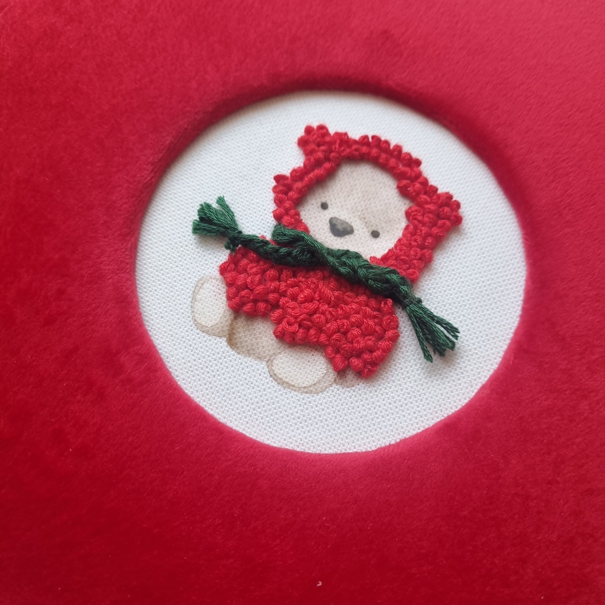 Tinka tiek mergaitei, tiek berniukui. Viršelis dengtas raudonos spalvos veliūru, žavingas meškutis siuvinėtas rankomis.