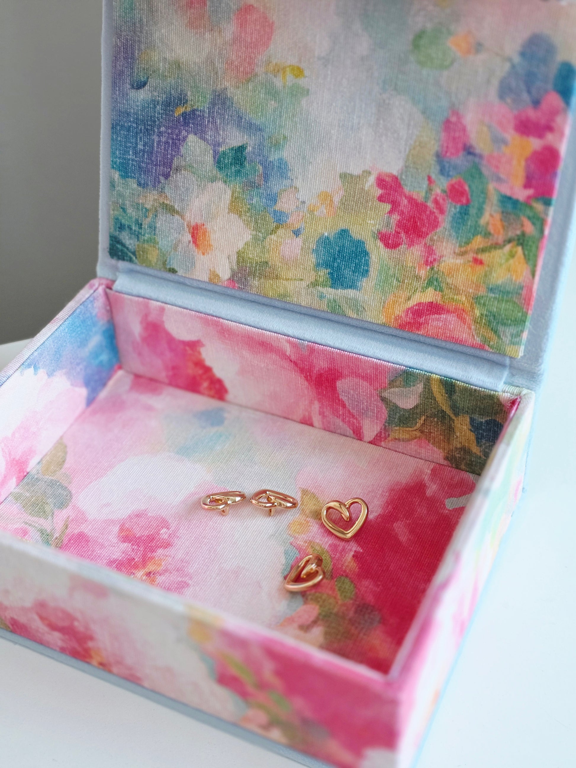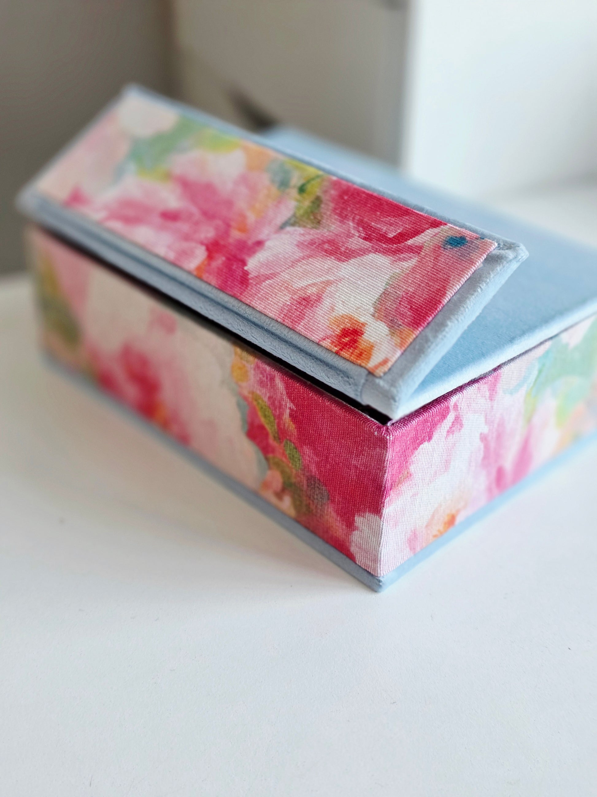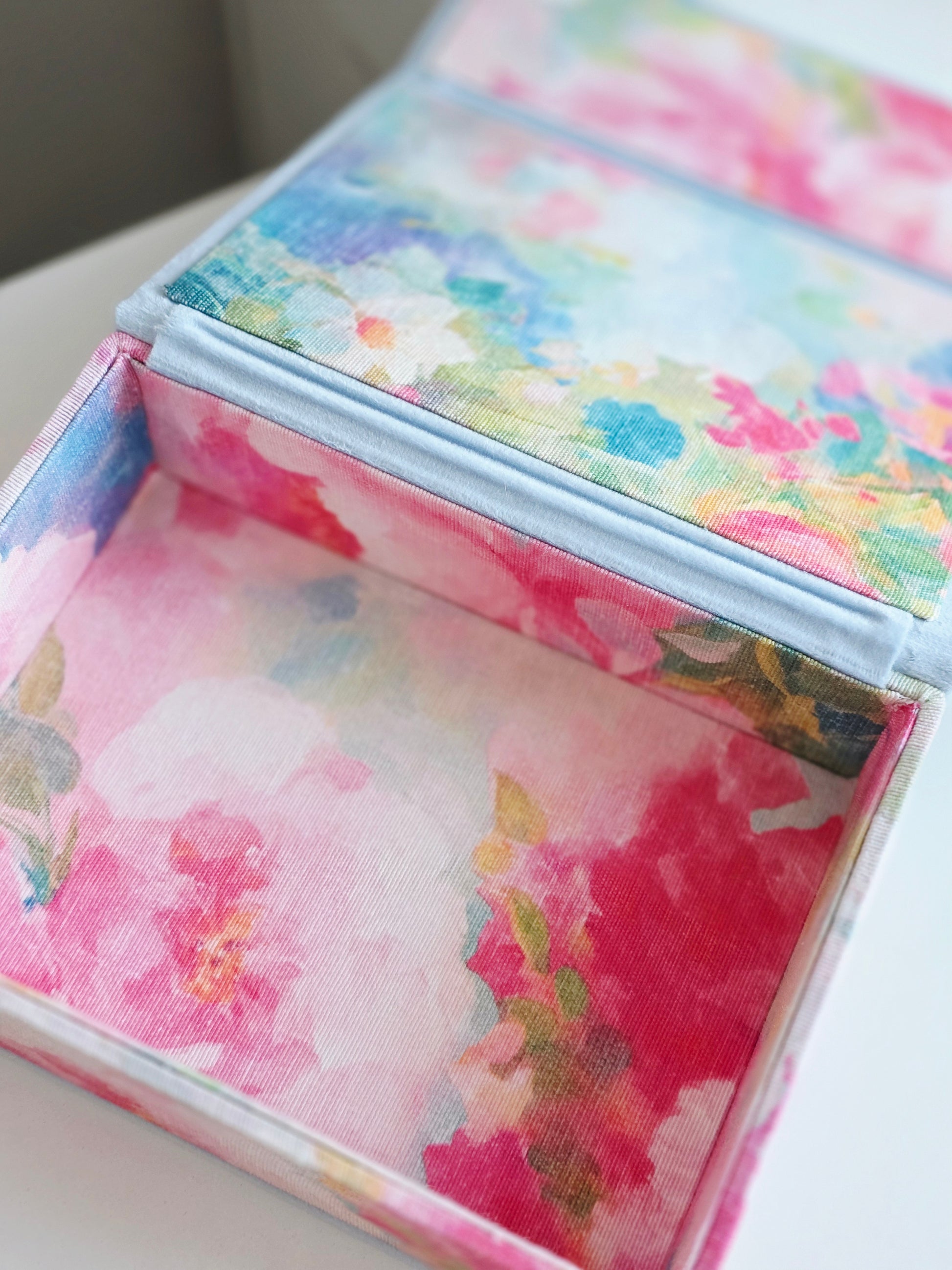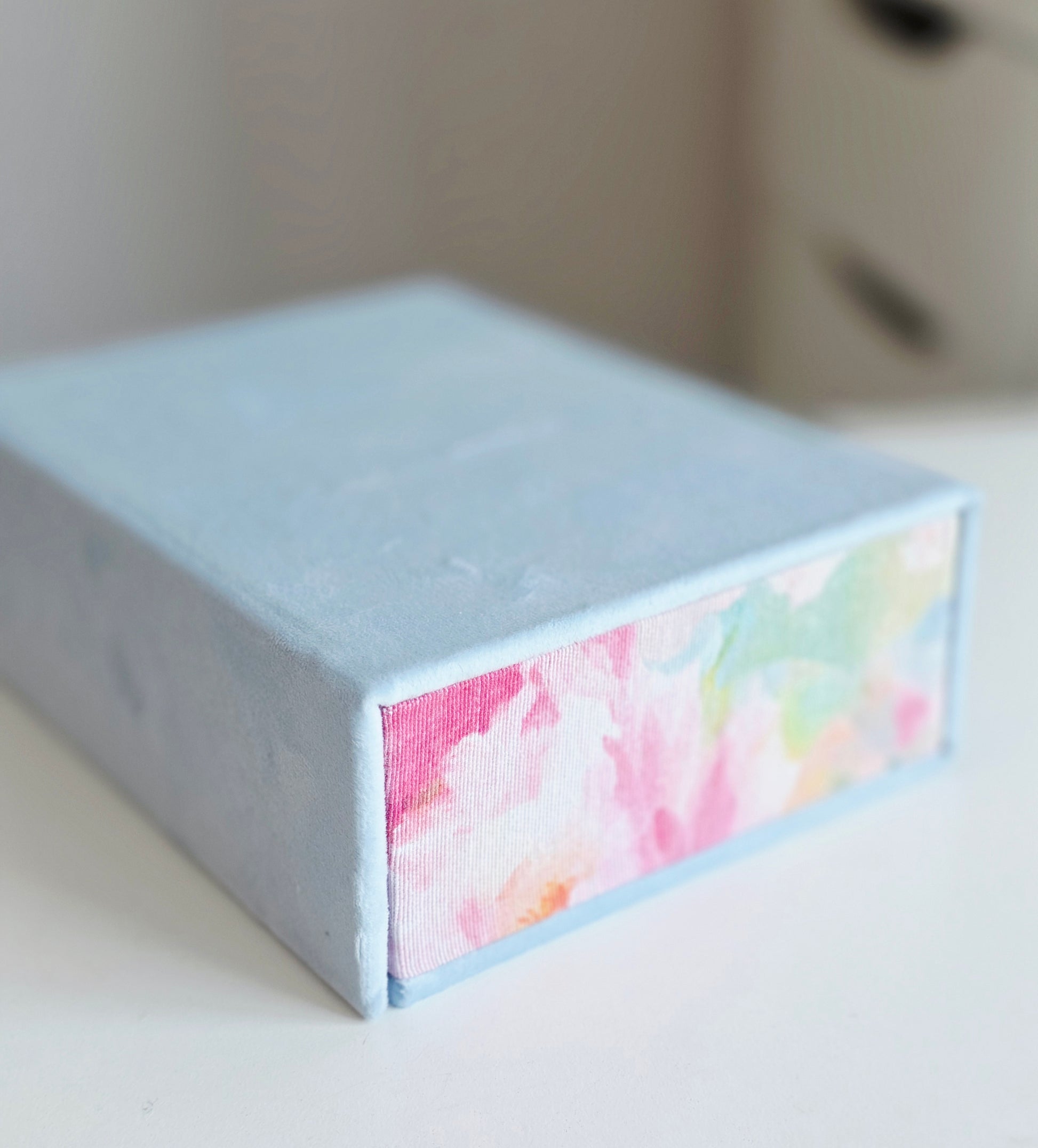 Nuostabus pastelinis spalvų derinys. Švelnus žydras veliūro korpusas ir įkvepiantis spalvingas vidus. Atidarę dėžutę įkvėpsite gaivaus gėlių aromato , akį džiugins žavinga tapyba.