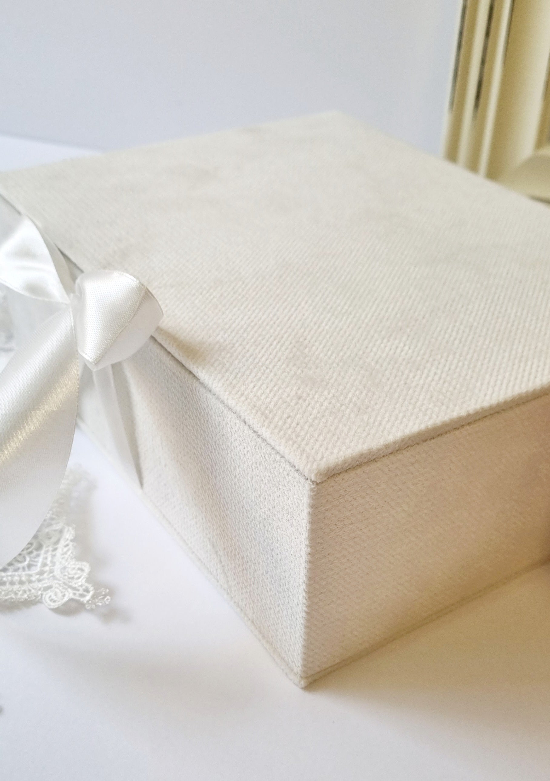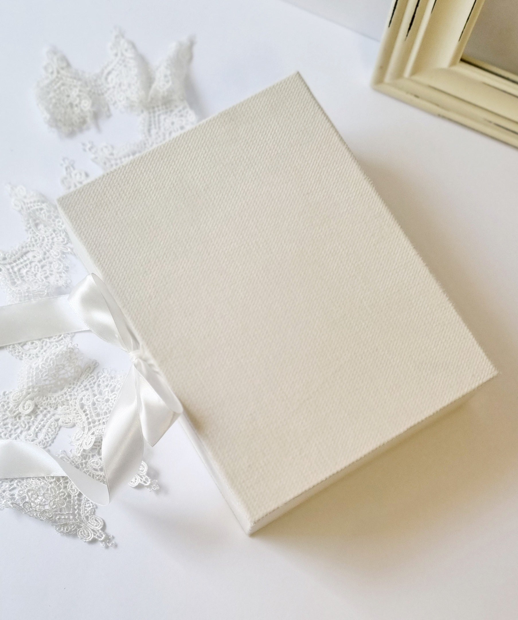 Dėžutės dydis 17x23x7 cm, užrišama kaspinu.
