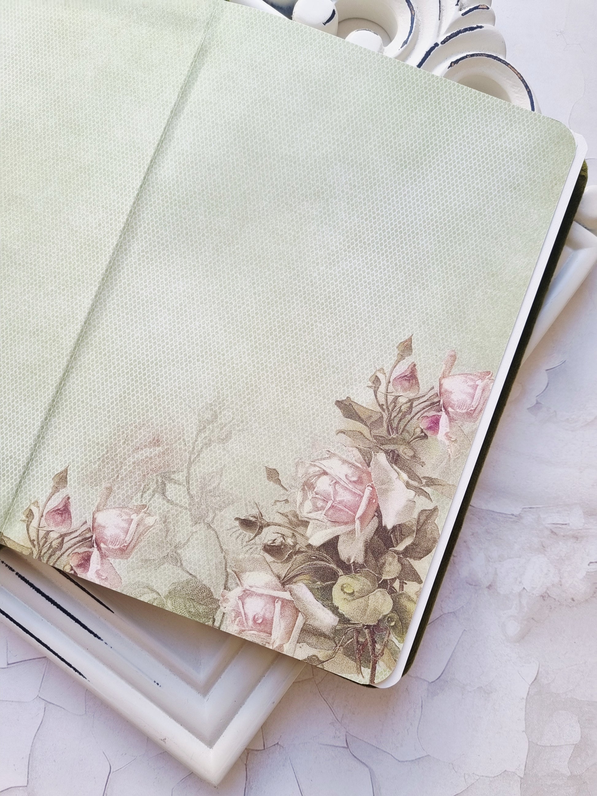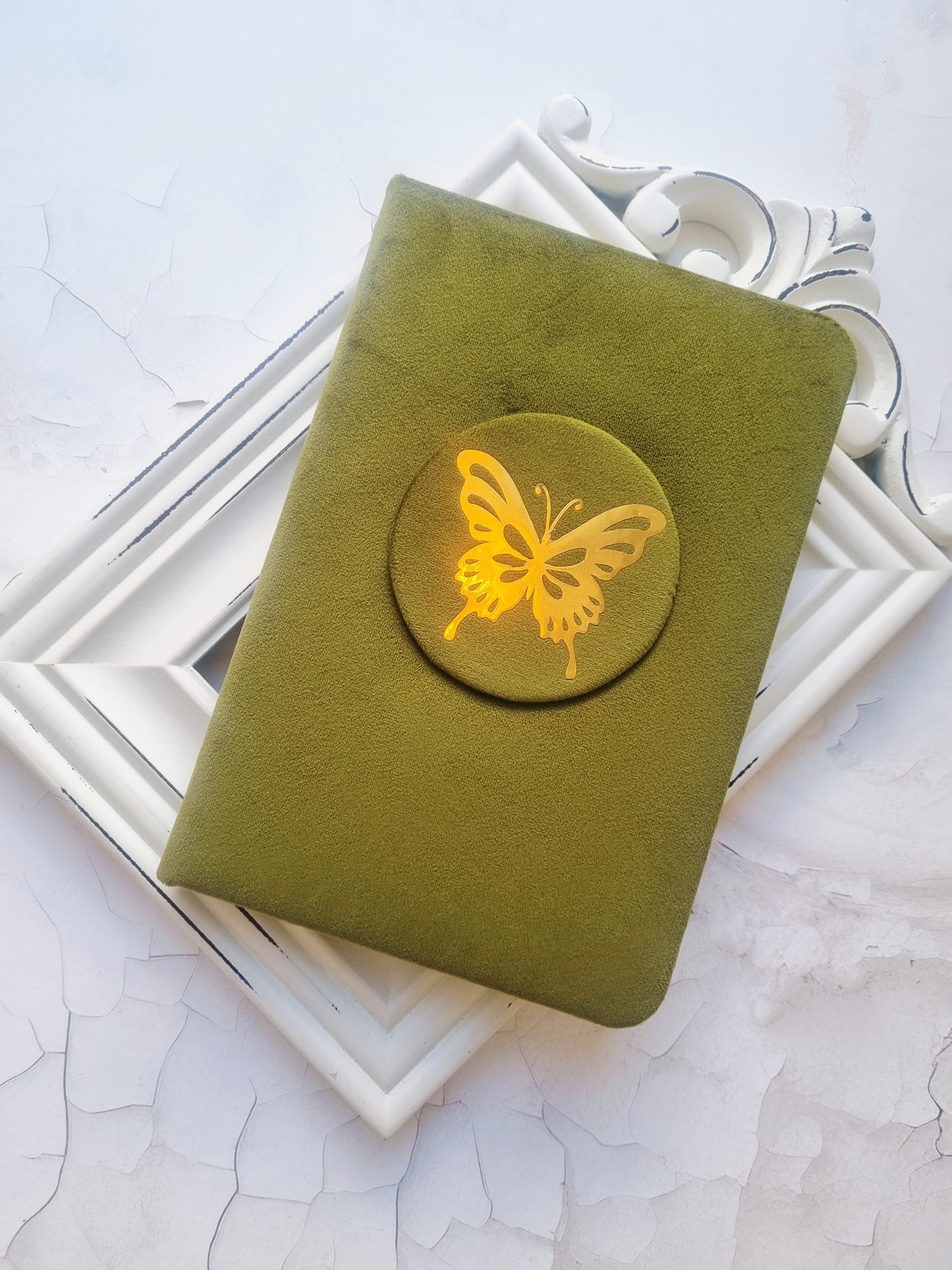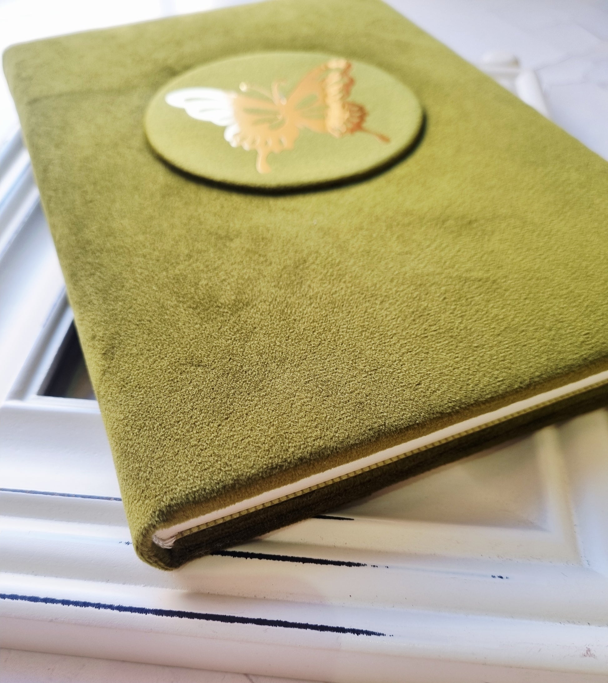 Švelniu samanų spalvos veliūru dengtas viršelis papuoštas auksiniu drugeliu.