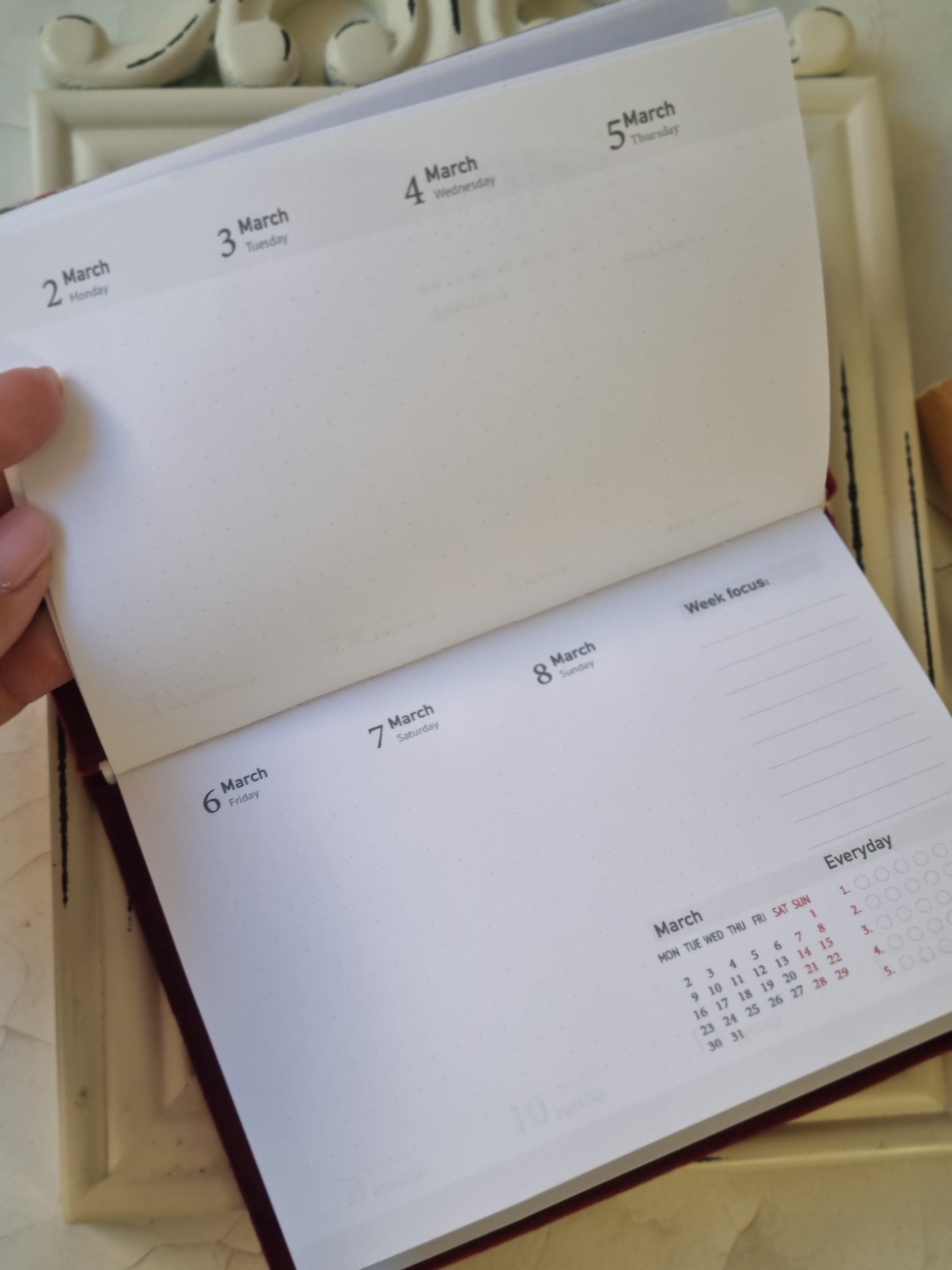 Atvertę matysite visą savaitę, mėnesio kalendorių ir turėsite vietos pasirašyti savaitės planui.