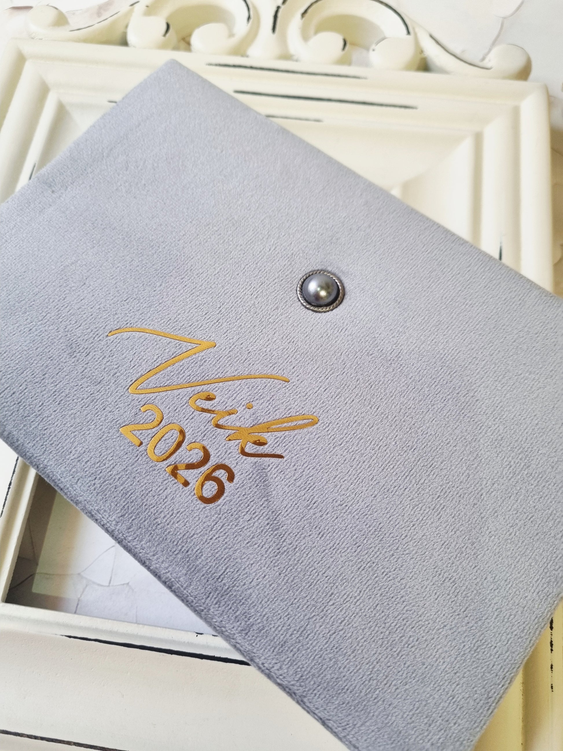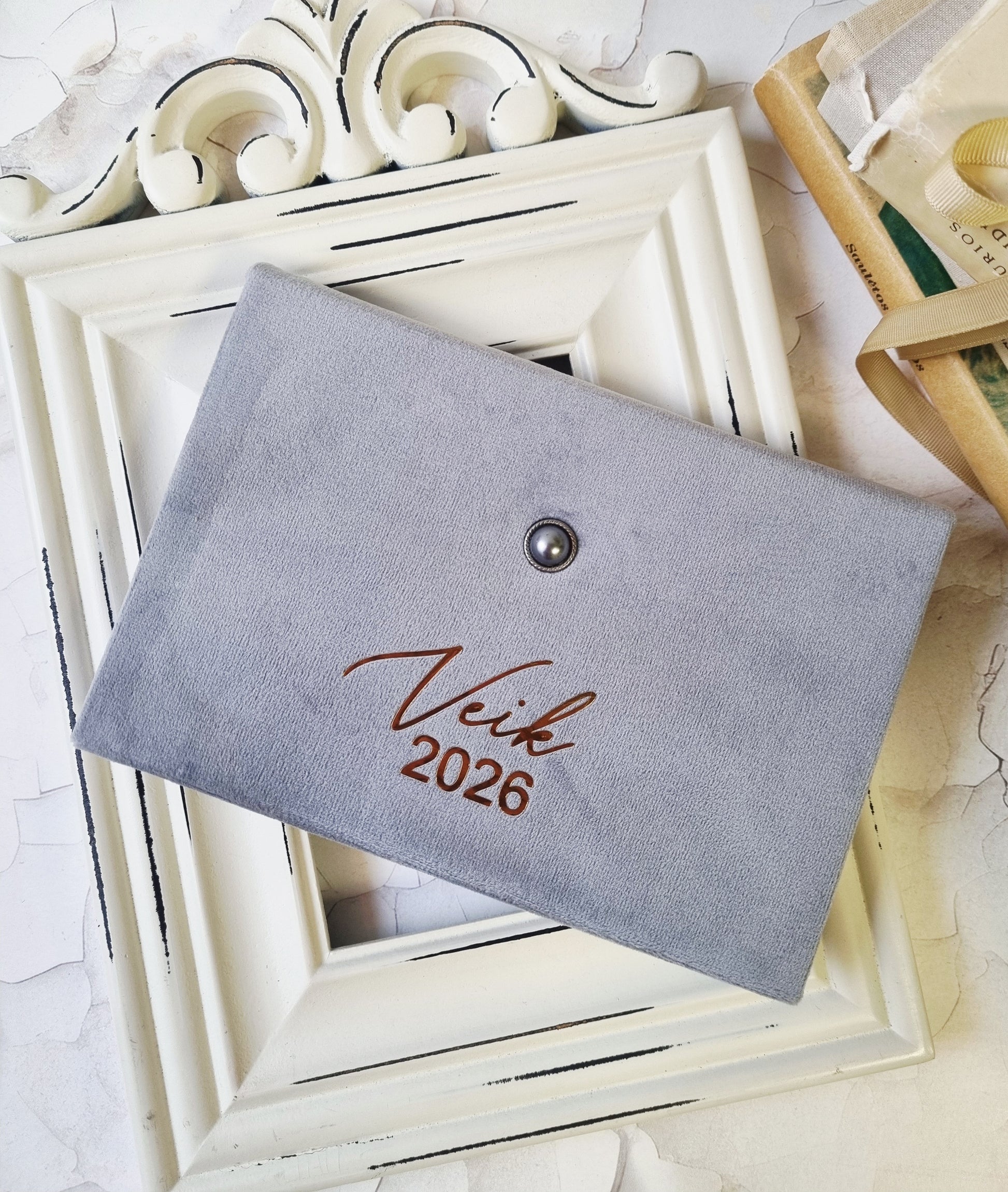 Viršeliai dengti švelniu veliūriniu audiniu, papuošti dailia sagute ir aukso spalvos užrašu.