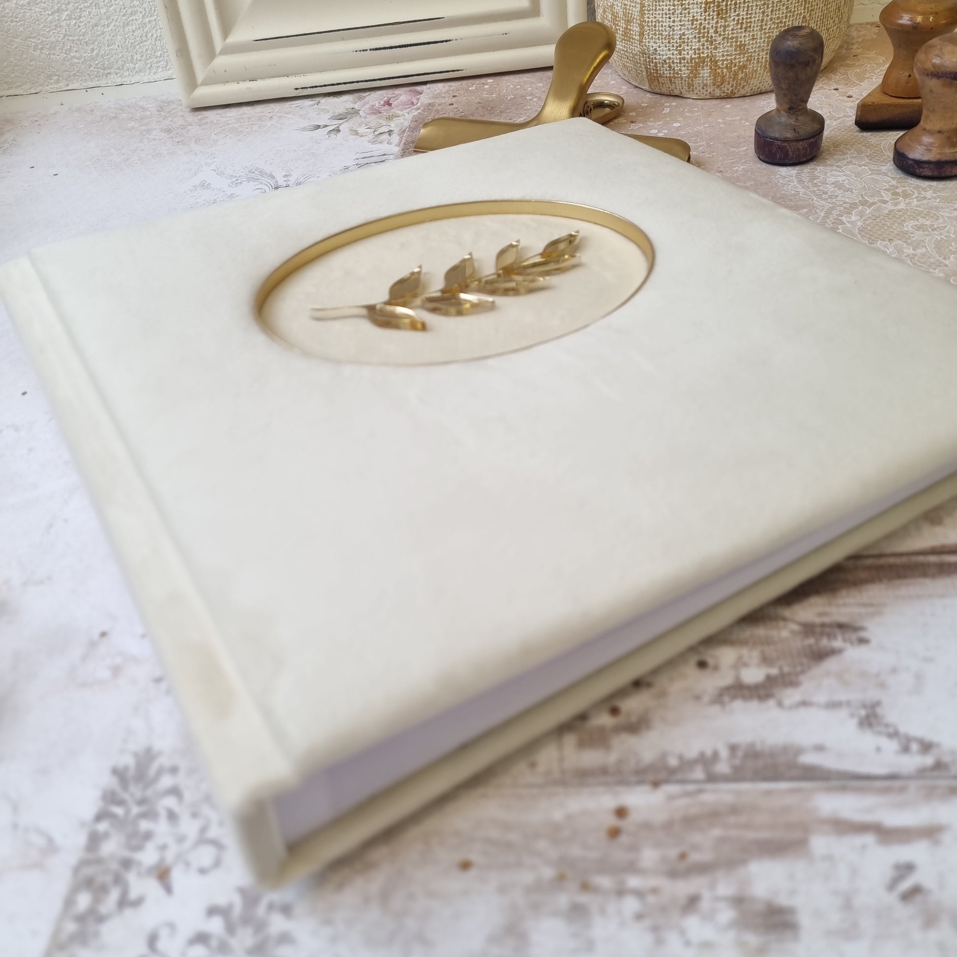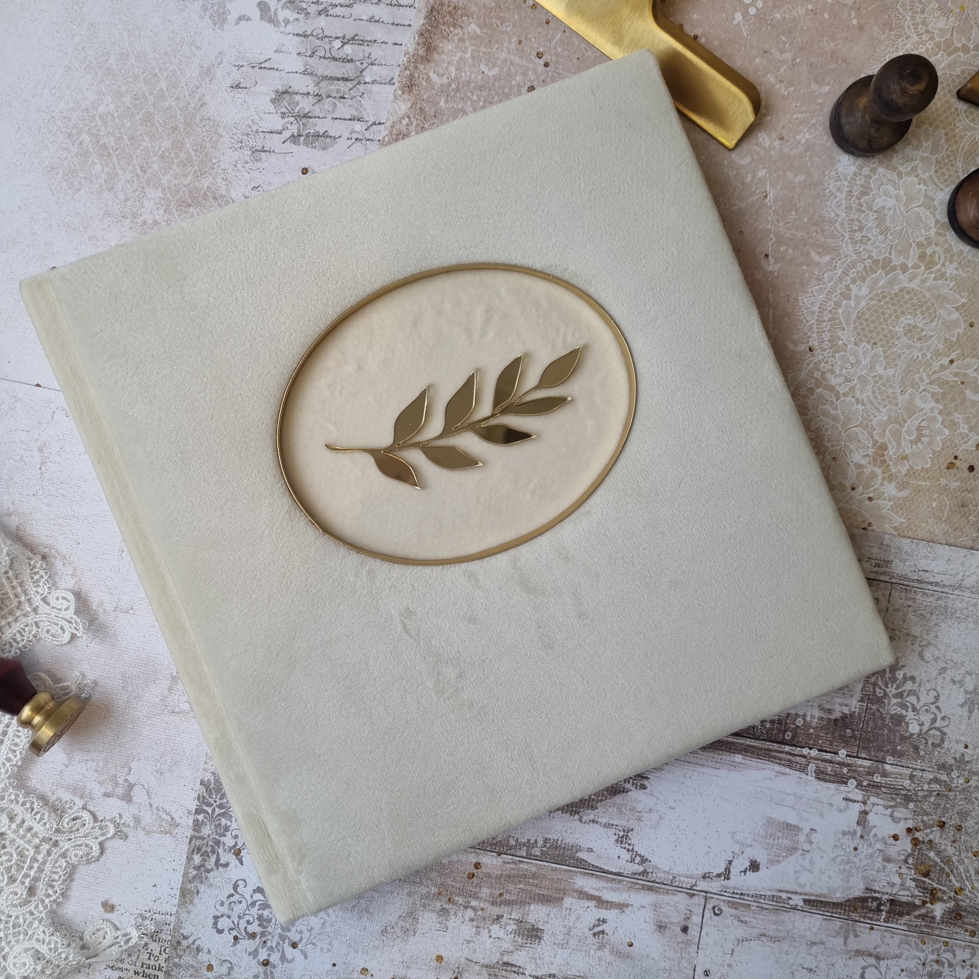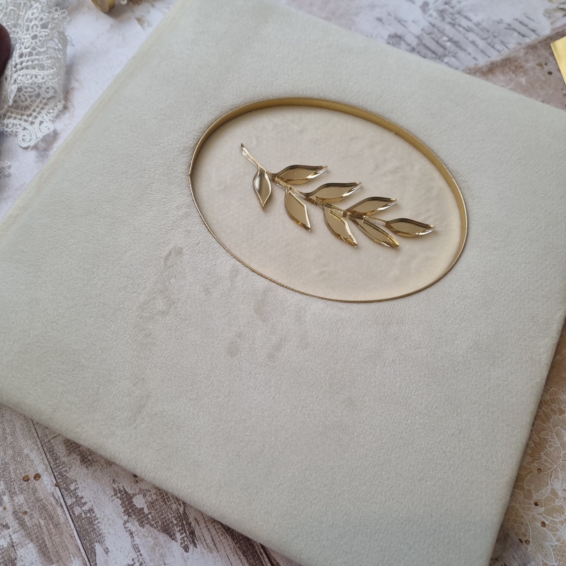Dramblio kaulo spalvos veliūru dengtas viršelis papuoštas įgilintu rėmeliu, apvestu aukso spalvos kantu, viduryje veidrodinė šakelė, kuri simbolizuoja naujos šeimos medį. Simboliška ir labai tinka vestuvėms.