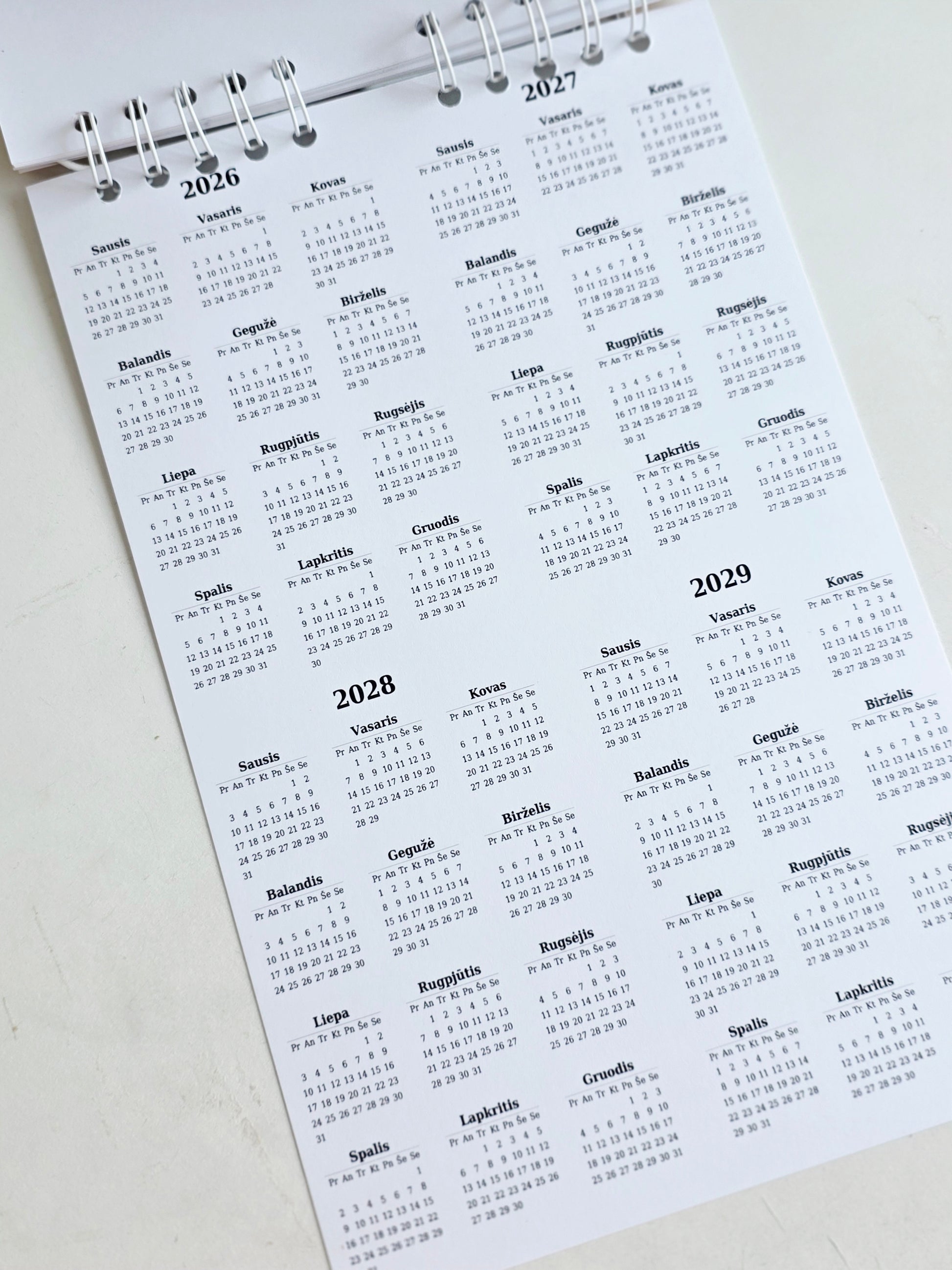 Kalendoriuje nėra konkrečių datų, tad naudosite jį metų metus. O kad lengviau būtų susigaudyti savaitės dienose, paskutiniame puslapyje rasite net 4 metų kalendorius, nuo 2026 iki 2029 metų,