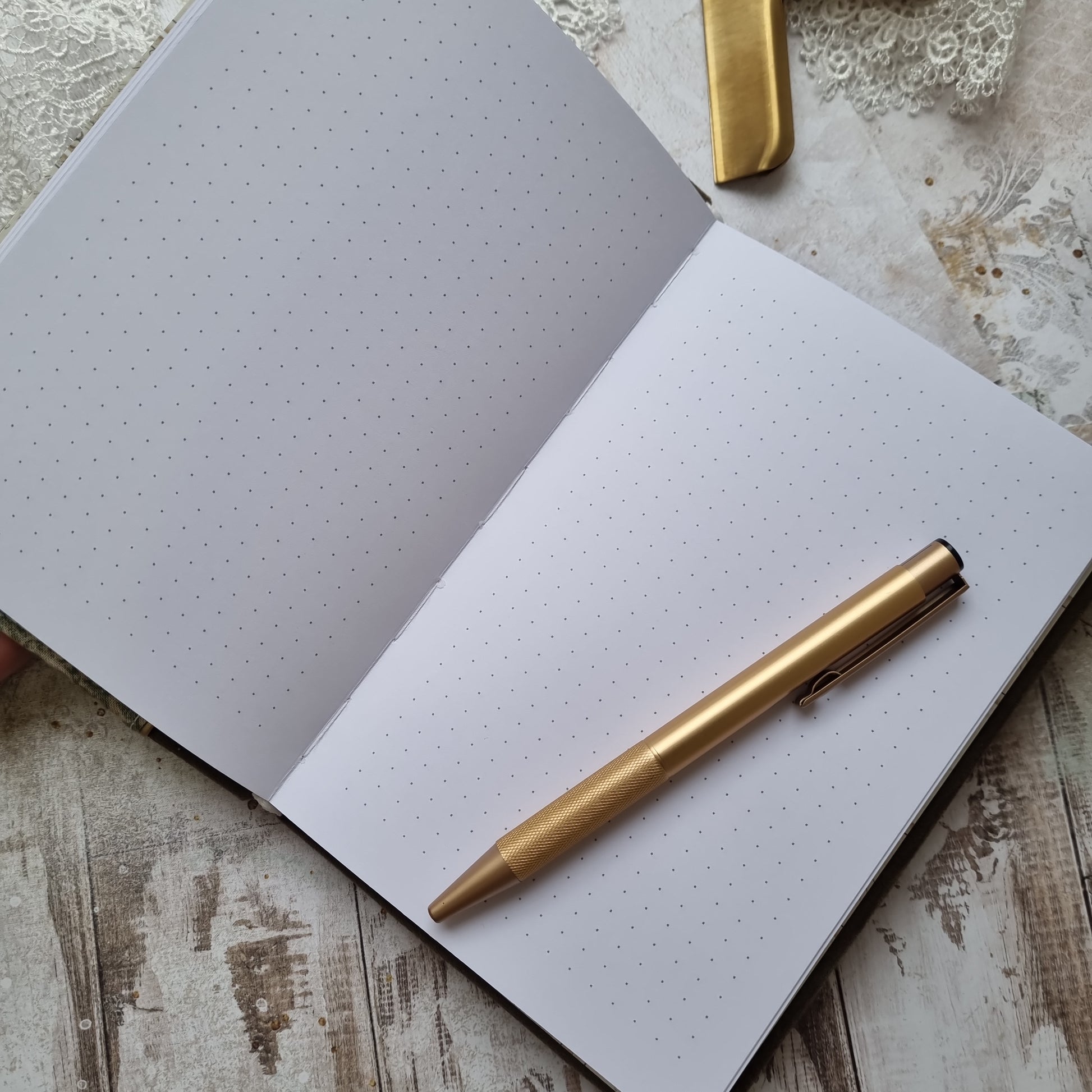 Knygelė yra pilnai rankų darbo, lapai siūti iš kietesnio popieriaus su taškeliais. Malonu rašyti ar piešti, nepersigeria rašalas.
